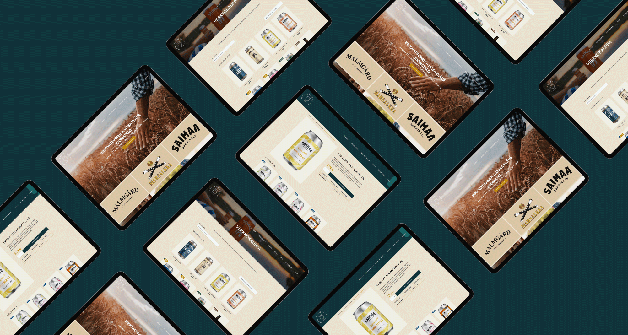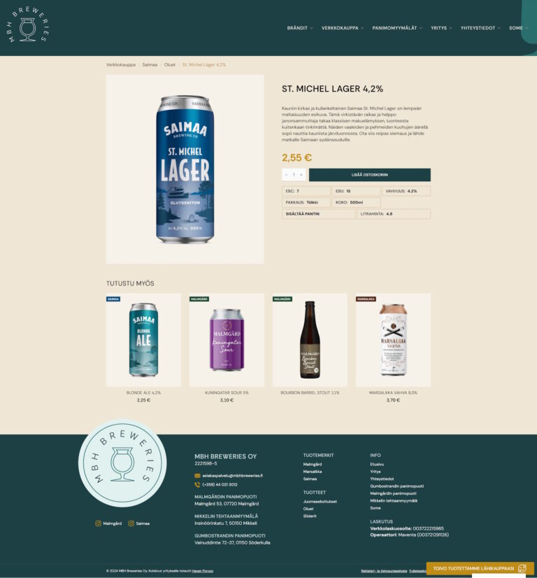 Verkkopalvelun osalta suunnittelutyö käynnistyi sen jälkeen, kun visuaalinen ilme oli luotu ja isot suuntaviivat graafisen ulkoasun osalta olemassa. Tämän WordPress-verkkopalvelun ulkoasu ja käyttöliittymä on suunniteltu tukemaan vahvasti panimobrändien omaleimaista kuvamaailmaa sekä MBH-brändin värejä ja graafisten elementtien muotoja. Osana verkkopalvelua toteutimme kaikille yrityksen tuotteille tarkoitetun WooCommerce-verkkokaupan, josta sekä näkee tuotteet ja niiden tuotetiedot, että voi tilata juomat noudettavaksi lähimmästä panimomyymälästä. Käytimme verkkopalvelun teknisessä toteutuksessa monipuolista, teknisesti suorituskykyistä ja helppokäyttöistä Breakdance-sivurakentajaa, joka tarjoaa laajan kirjon sisäänrakennettuja toiminnallisuuksia sivuston ja verkkokaupan toteuttamiselle.