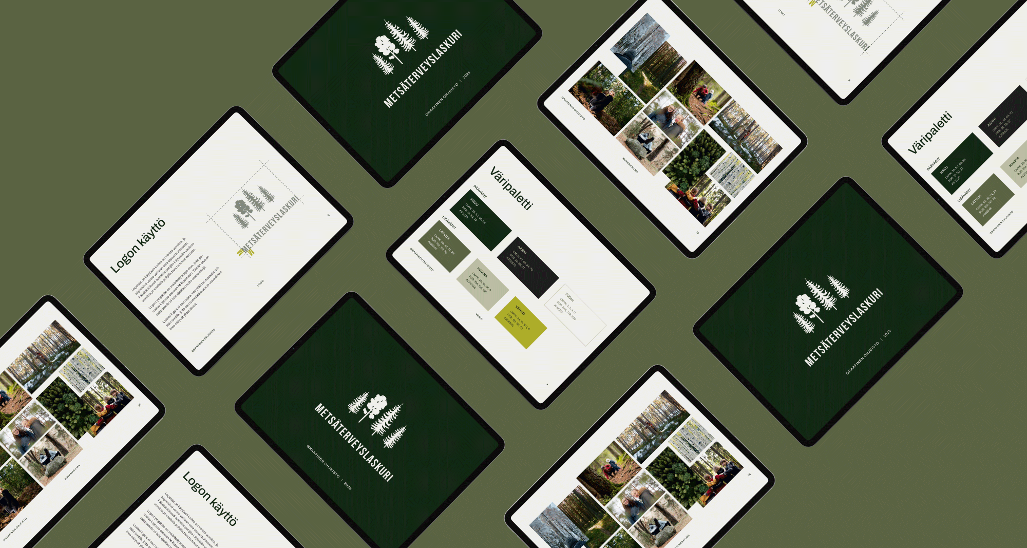 Projektin alkuvaiheessa loimme hankkeelle visuaalisen identiteetin, joka ilmentää luonnon ja ihmisen hyvinvoinnin yhteyttä. Visuaalinen ilme rakentuu luonnonläheisistä sävyistä – havu, aarni ja tuohi – joita täydentävät vivahteikkaat lisävärit latvus, havina ja verso. Typografia valinnat tuovat kokonaisuuteen modernia selkeyttä ja takaavat erinomaisen luettavuuden.