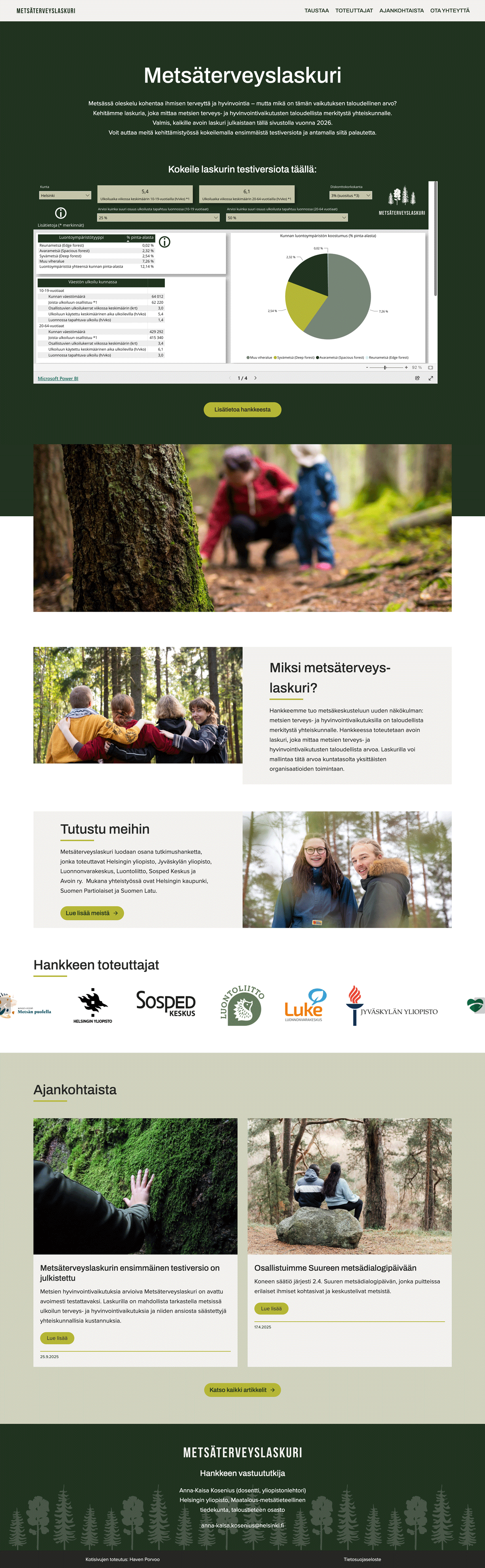 Tuloksena syntyi moderni, luonnonläheinen ja helposti lähestyttävä verkkopalvelu, joka tuo esiin metsien terveysvaikutuksia visuaalisesti ja viestinnällisesti kiinnostavalla tavalla. Uusi visuaalinen identiteetti vahvistaa hankkeen tunnistettavuutta ja tarjoaa johdonmukaisen pohjan kaikelle viestinnälle – verkossa ja sen ulkopuolella.